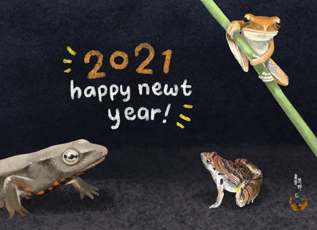 Hong Kong newt (Paramesotriton hongkongensis; bottom left), marbled pygmy frog (Microhyla pulchra; bottom right) and brown tree frog (Polypedates megacephalus; top).