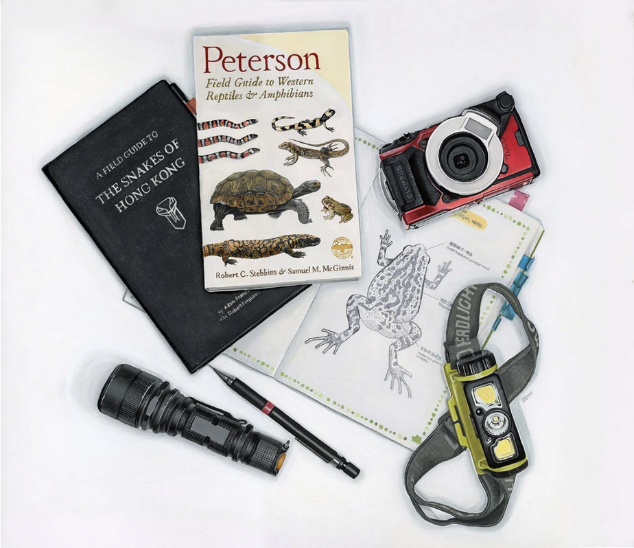 All my usual herping gear (headlight, torch, and Olympus TG-5) with some of my field guides.
