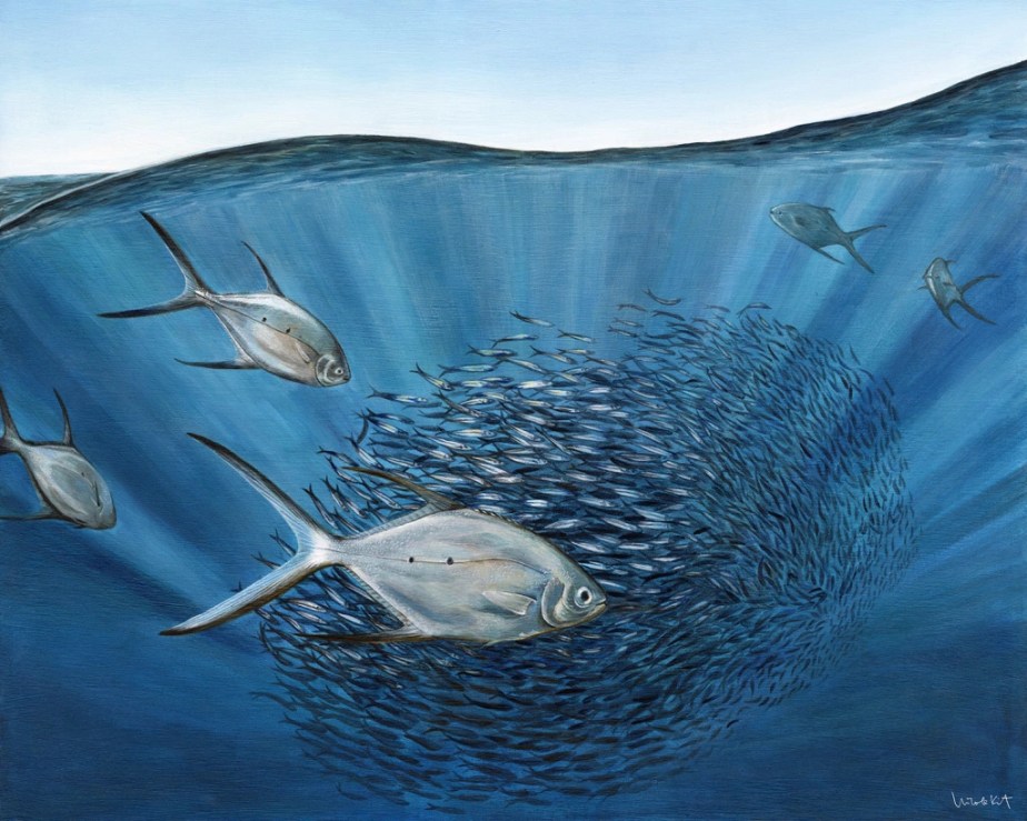 In the tropical Indo-Pacific waters, a shoal of smallspotted darts is hunting on a bait ball. These fast-moving pompanos love the surface water but are often hard to observe in the wild, as they are fast and timid. I was lucky to be able to observe them as they were focused on hunting the silvery anchovies.